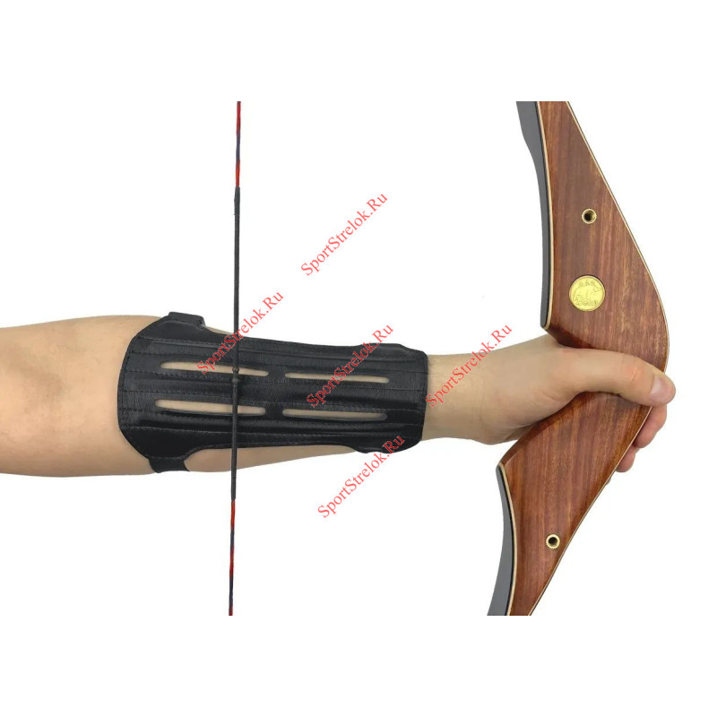 Крага изготовлена из натуральной высококачественной кожи. Внутренняя поверхность краги мягкая, что позволяет комфортно носить крагу на голой руке. Предусмотрены отверстия для вентиляции для ношения в помещениях и на улице в теплое время года. Крага дополнительно армирована гибкими пластиковыми ребрами жесткости, предотвращающими удар тетивой лука во время выстрела. Подходит для любого размера руки.