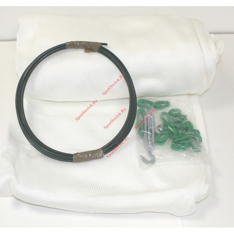 Сетка сделана из синтетического волокна. Поставляется вместе с тросом и кольцами дл крепления. Длина сетки 8 метра. Высота сетки от 2,7 до 3,1 метра.